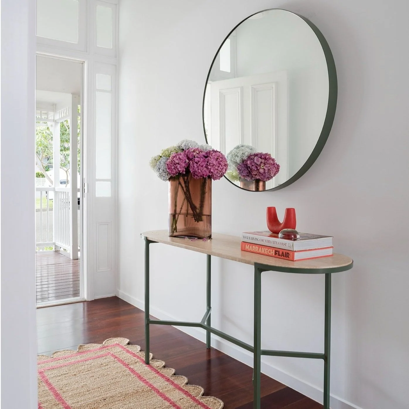 Create a beautiful welcome to your home with a vase of flowers on your entry table. I love Hydrangeas and the bigger the bunch the better. Combine the vase of flowers with some coffee table books, a colourful ornament or pretty candle.