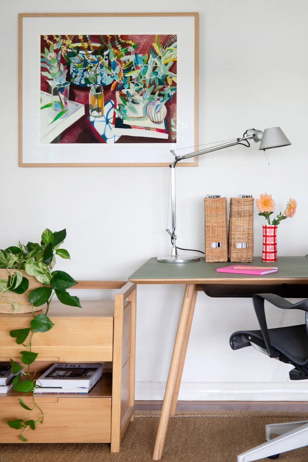 The leather sofa in the home office was repurposed from the living room and feels right at home here alongside the rattan lamp base, sisal rug and African baskets on the wall.