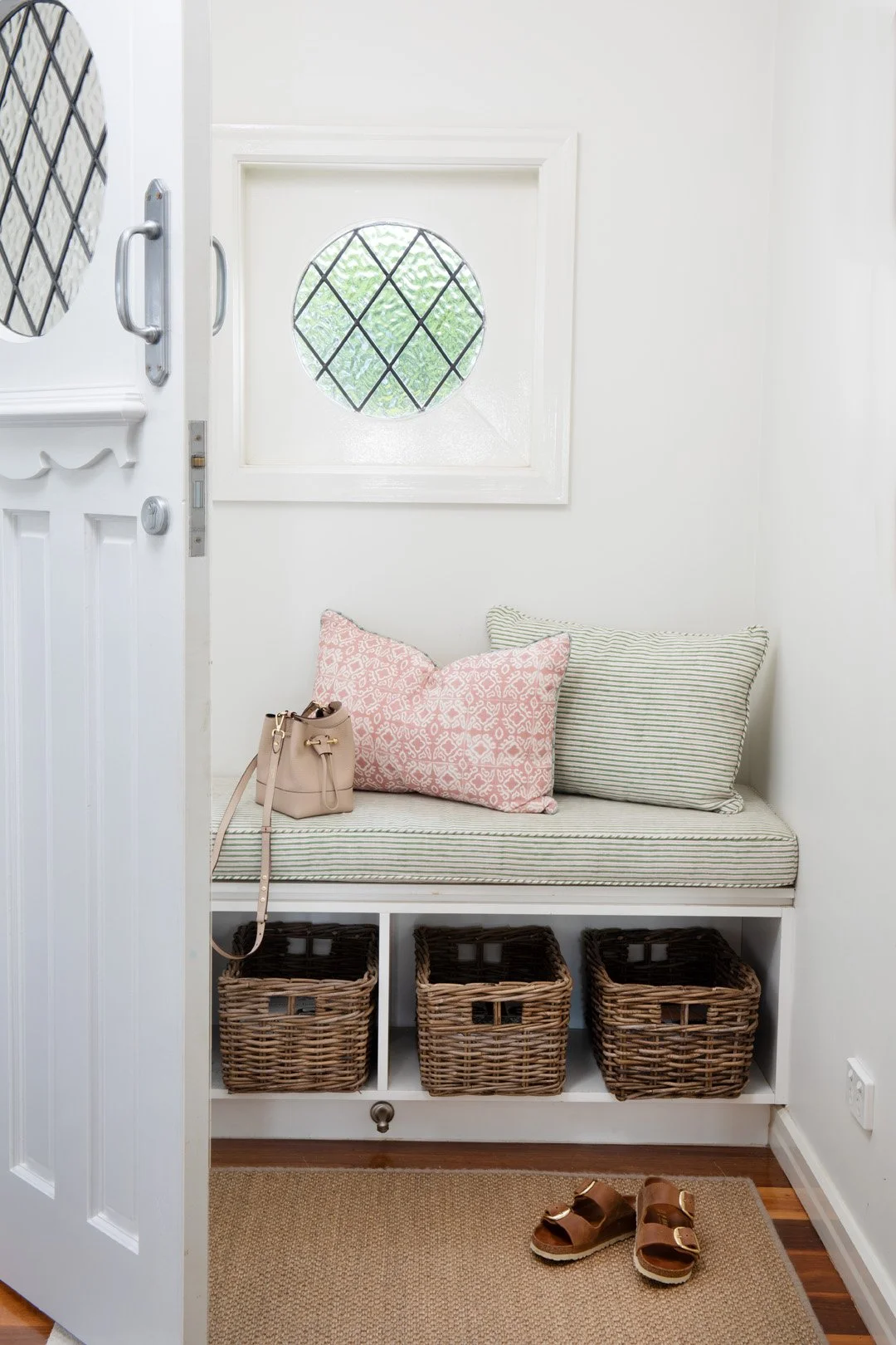 This entry to the home has been softened with a custom made seat cushion and sisal rug and made useful with baskets for shoes. The textiles and colours used in the entry are an introduction to the home and a taste of what is to come.