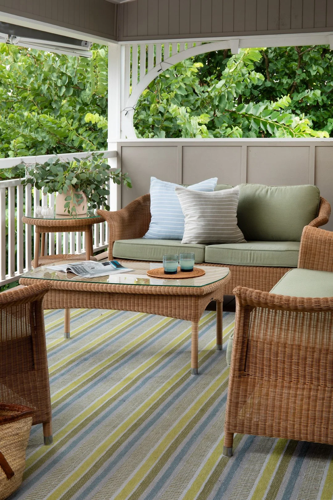 “The deck is where we spend all of our time” our clients explained at our initial briefing meeting. We designed ‘the deck’ as an outdoor living room with comfortable Vincent Sheppard furniture, a striped rug and custom furnishings in fabrics and colours that complemented those used indoors whilst also reflecting the colours of nature.