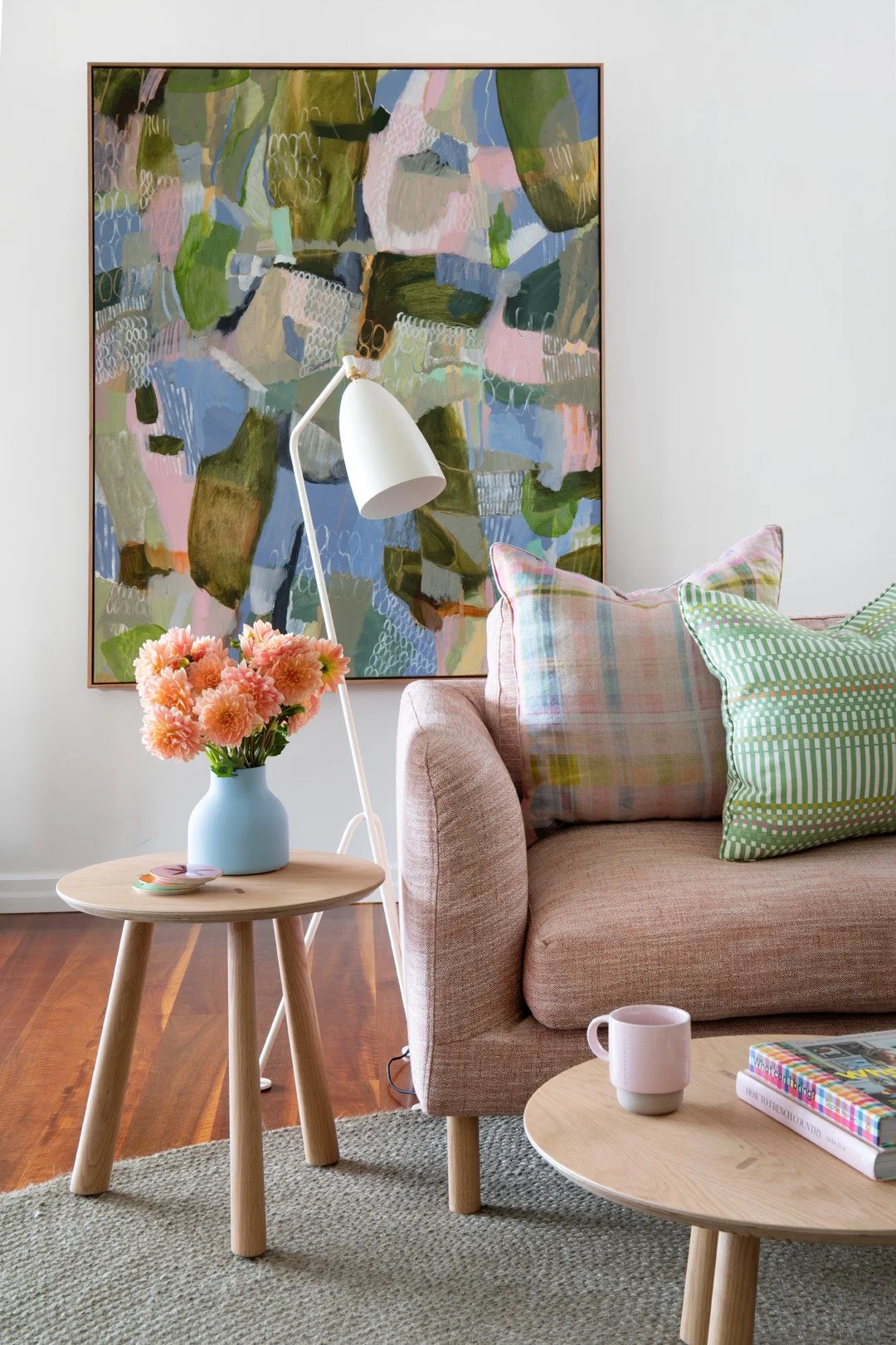 The living room incorporates a combination of soft calming shades of greens, blues, oranges and pinks in a way that reflects nature. The artwork by local artist, Sarah Daly is a commission piece of an overhead view of the landscape based on a map of the suburb where this family have lived for the past 20 years.