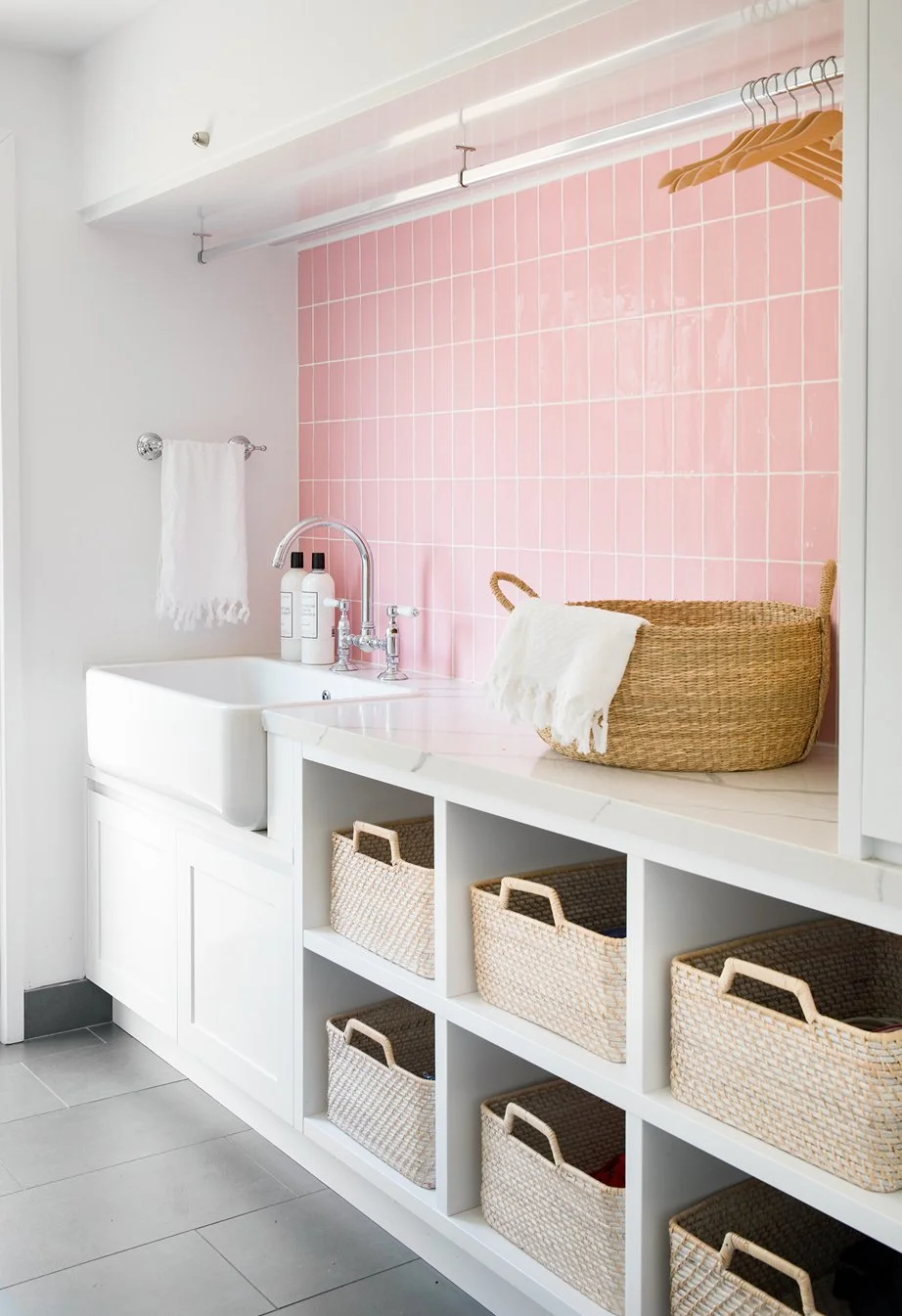 The family laundry in our Pretty In Pink project is designed with this basket system in mind. There is a basket for clean clothes for each member of this family of 7. Photograph from the article in Home Beautiful March 2020.