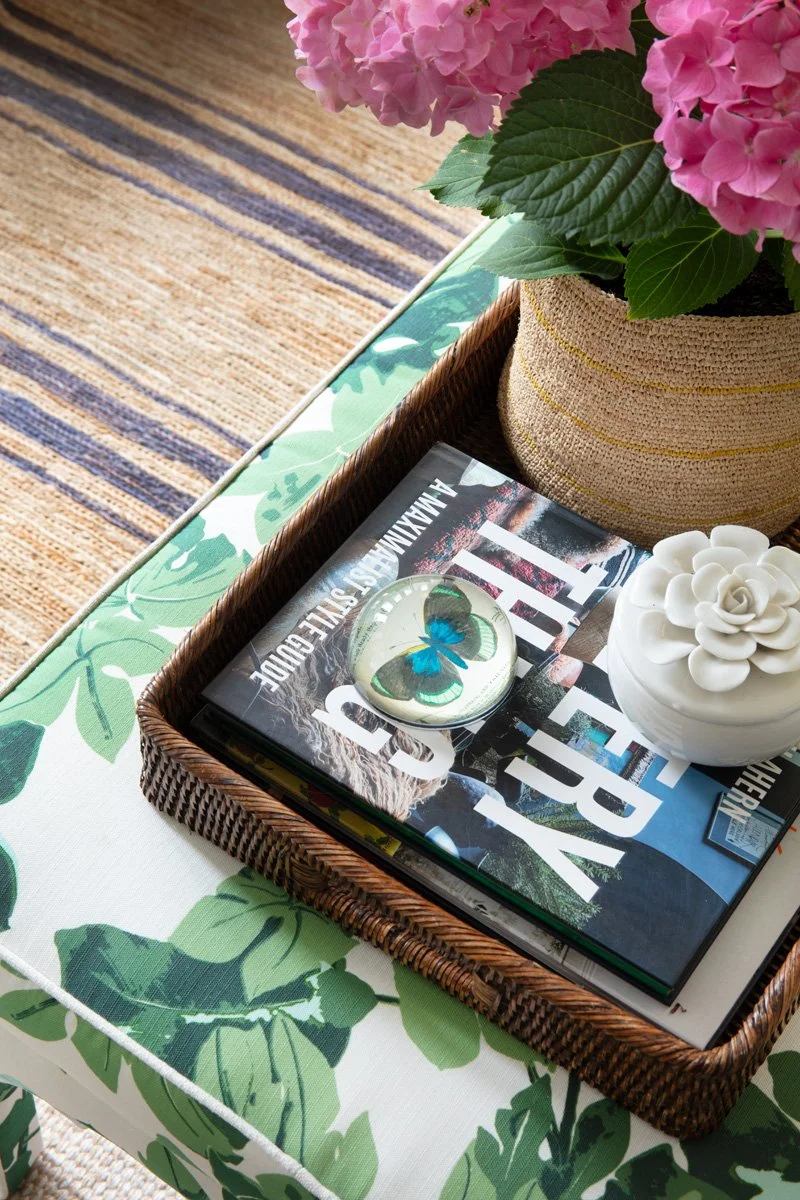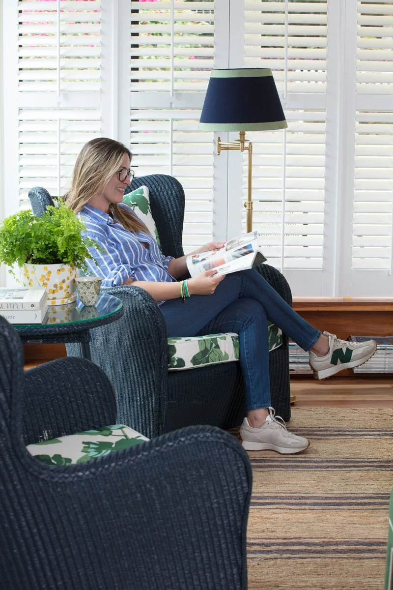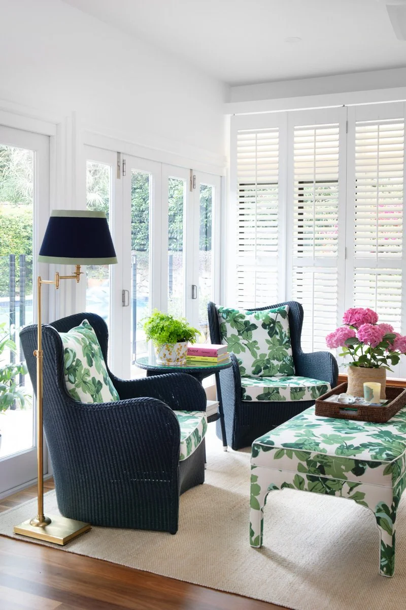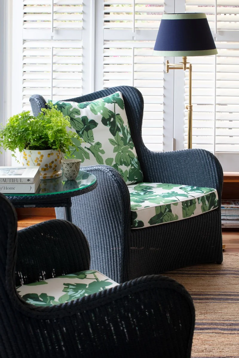 The Hamilton Sunroom, with its navy rattan furniture, pinstripes, and fig leaf fabrics—all in durable indoor-outdoor materials—is a stylish retreat overlooking the garden and pool. Adjacent to the kitchen, this sunlit space invites you to relax and enjoy morning coffee, seamlessly blending indoor comfort with Brisbane's outdoor lifestyle. It's a sunny, happy room where the line between inside and outside blurs effortlessly.